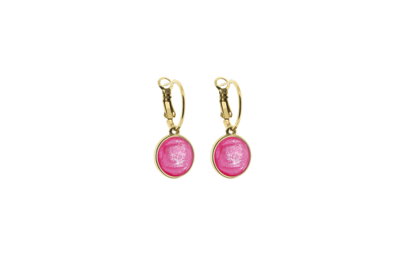 Ein Creolenohrring mit einer 12 mm Fassung und einem wunderschönen Cabochon. Der Ohrring besteht aus hochwertigem goldfarbenem Edelstahl und ist ca. 3,5 cm lang.