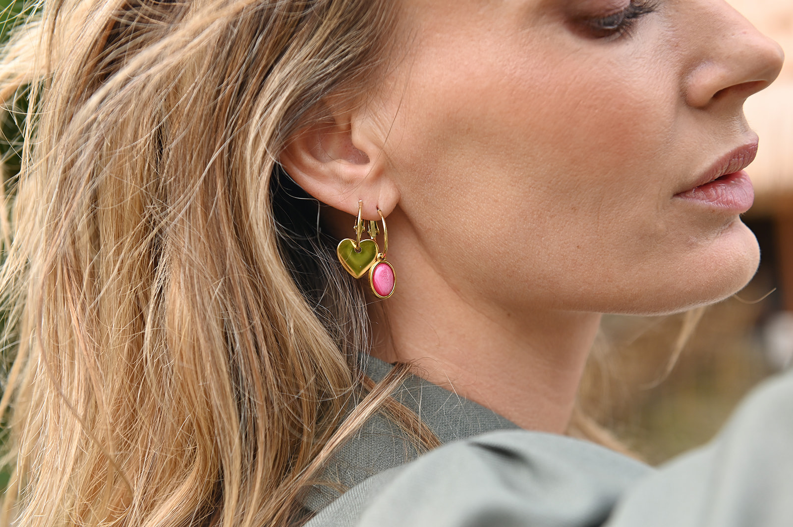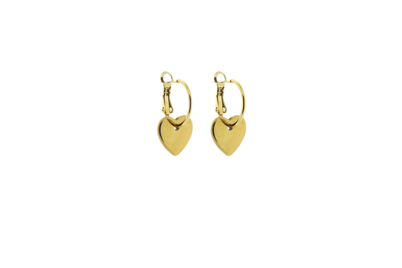Ein Creolenohrring mit einem schönen herzförmigen Anhänger von ca. 15x15 mm. Die goldfarbenen Teile bestehen aus hochwertigem Edelstahl. Vervollständigen Sie das Set mit dem passenden Ring!