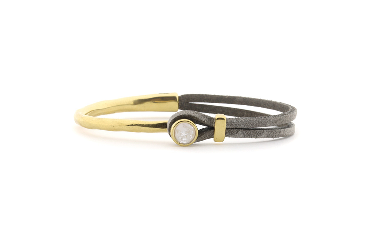 Bracelet made of 2.5mm buffalo leather with a gold-tone setting and a 6mm cabochon. The gold-tone components are made of high-quality stainless steel. The bracelet is approximately 7mm wide.