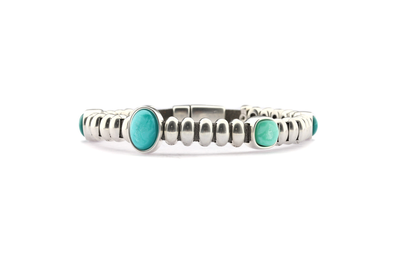 Bracelet made of 5mm wide buffalo leather, featuring a magnetic clasp and four settings in various shapes. The silver-colored components are made of high-quality, nickel-free metal. The bracelet is approximately 8mm wide.