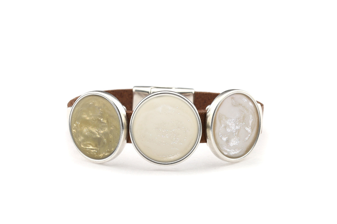 • A bracelet made of 10mm-wide buffalo leather and silver-colored links measuring approximately 12x6mm. The bracelet features three 20mm silver-colored settings with a cabochon series and closes with a magnetic clasp. The silver-colored components are made of high-quality, nickel-free metal.