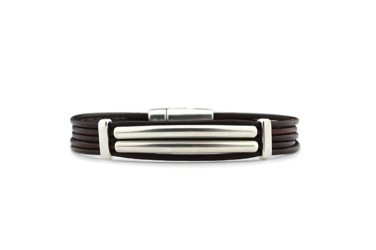 KAI is a bracelet consisting of multiple narrow leather strips with silver-colored elements strung onto them. Available in 2 colors and 6 sizes.