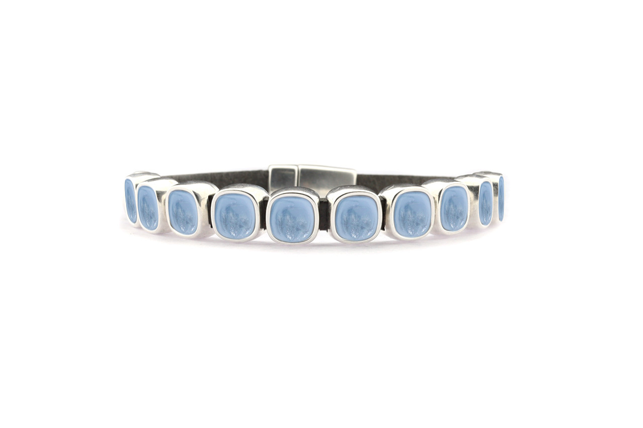 • Bracelet made of 5mm wide buffalo leather, with a magnetic clasp and 10 carre shaped settings with 7x7mm cabochons. The silver coloured parts are made of high quality nickel free metal.