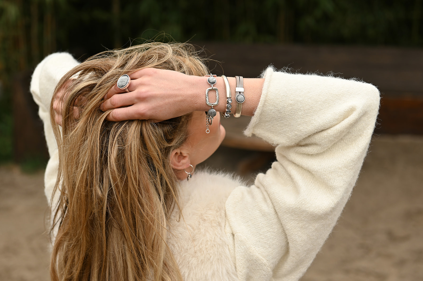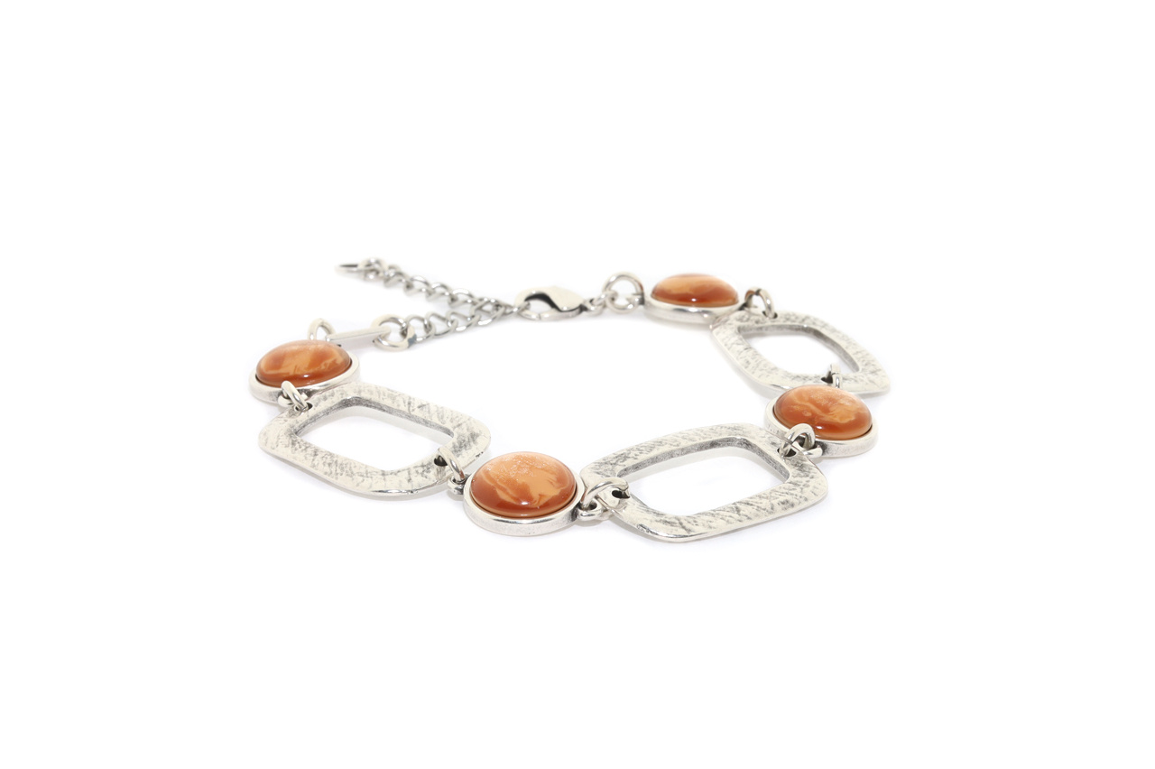 A silver-colored bracelet made of variously shaped open links alternating with 12mm settings. The components are made of high-quality, nickel-free metal and feature a lobster clasp with an extension chain. The bracelet is therefore adjustable to the perfect size, approximately between 18 and 23cm.