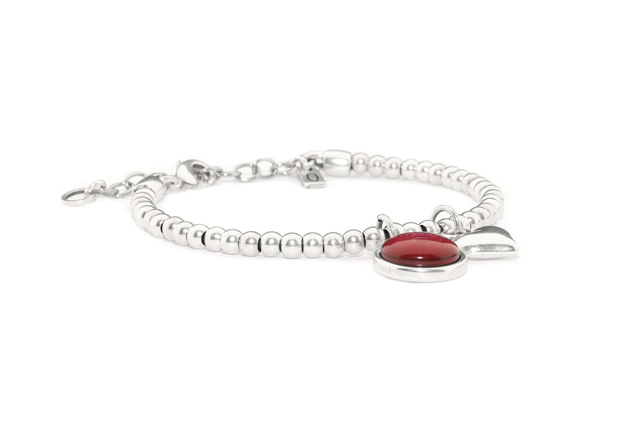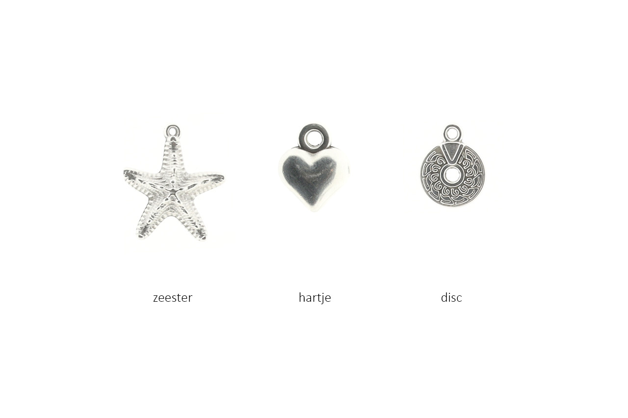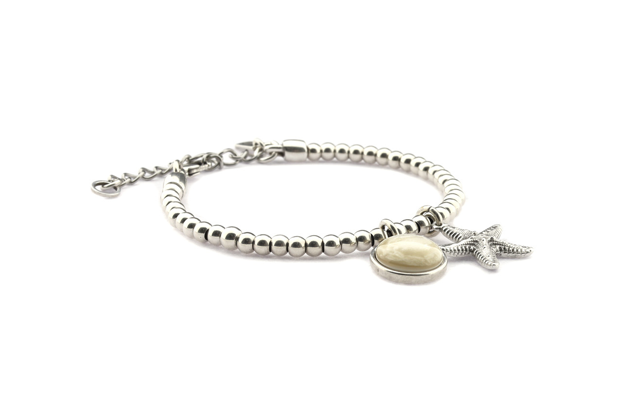 Bracelet made of 4 mm round, silver-coloured beads strung on leather, with a charm and a setting with a 12 mm cabochon. By the lobster clasp and the extension chain you can make the bracelet fit your wrist! The length of the bracelet is approximately 17-21cm.