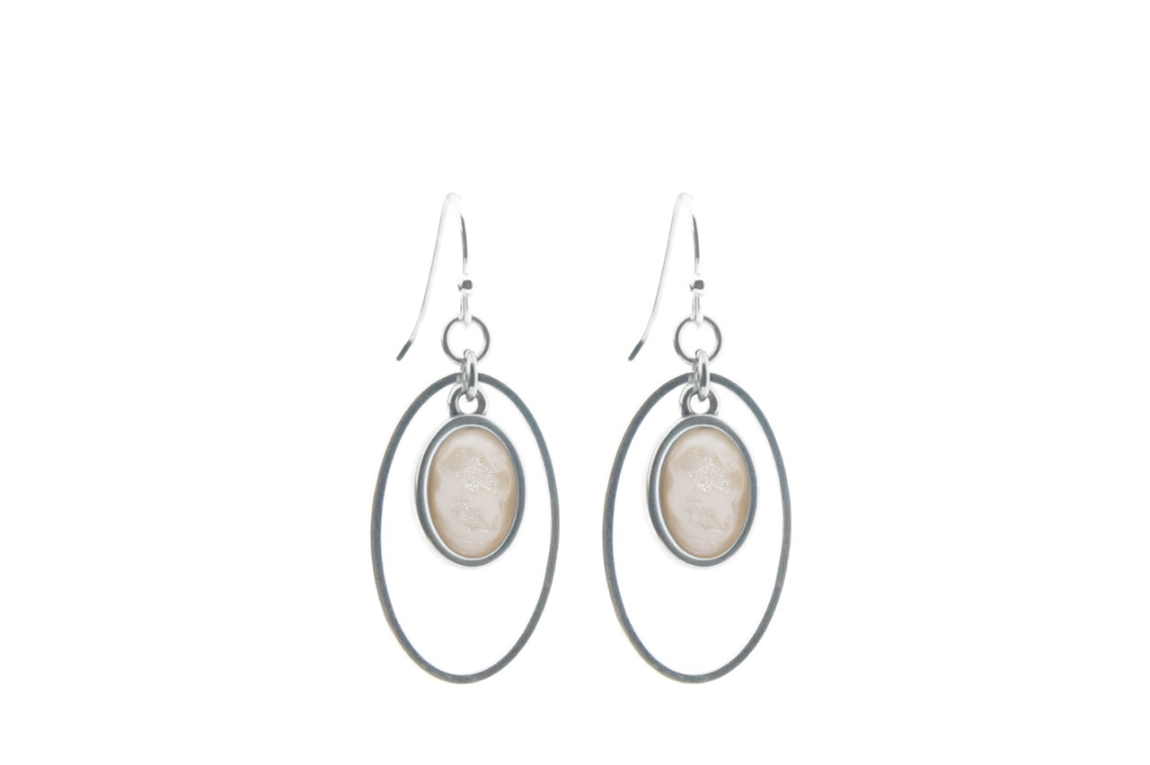 Een oorhaak met daaraan een ovale hanger en een ovale setting met een cabochon. De zilverkleurige onderdelen zijn gemaakt van hoogwaardig, nikkelvrij metaal. De oorbellen zijn ongeveer 4 cm lang.