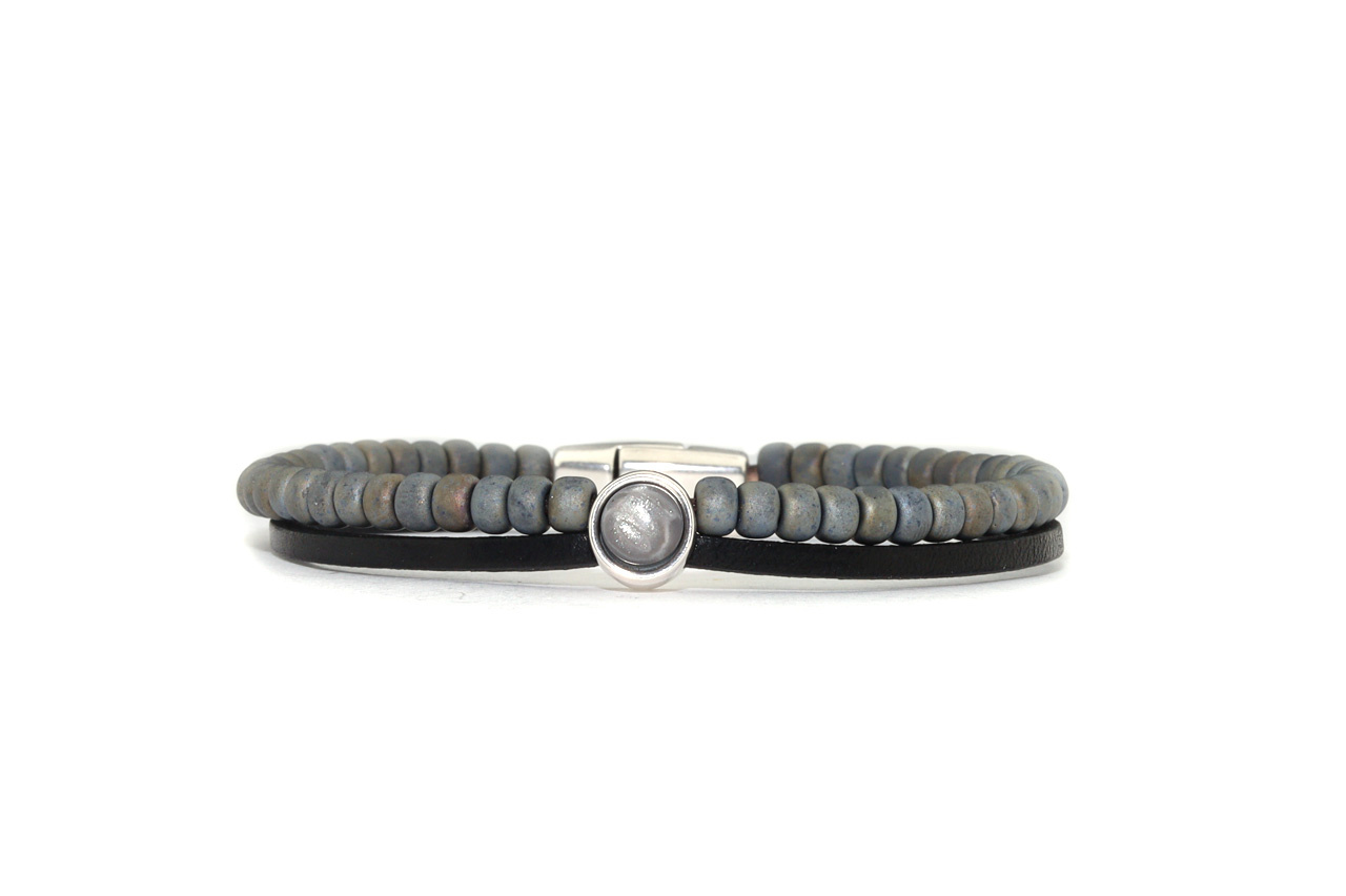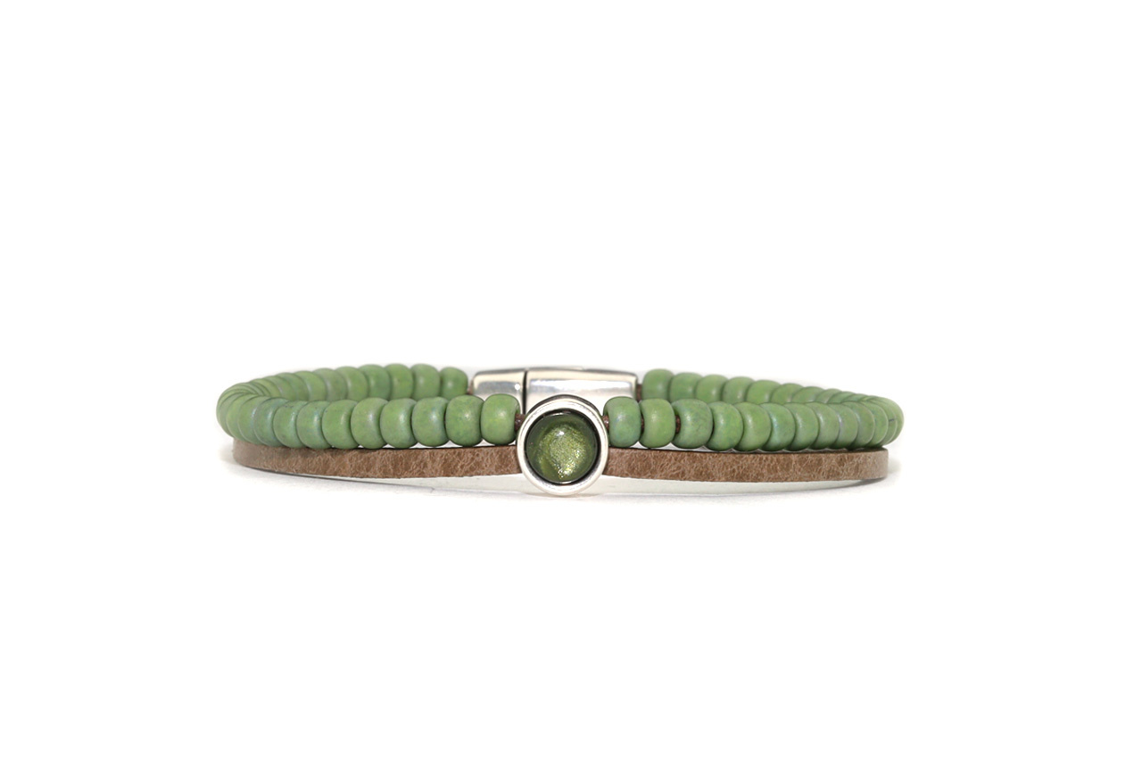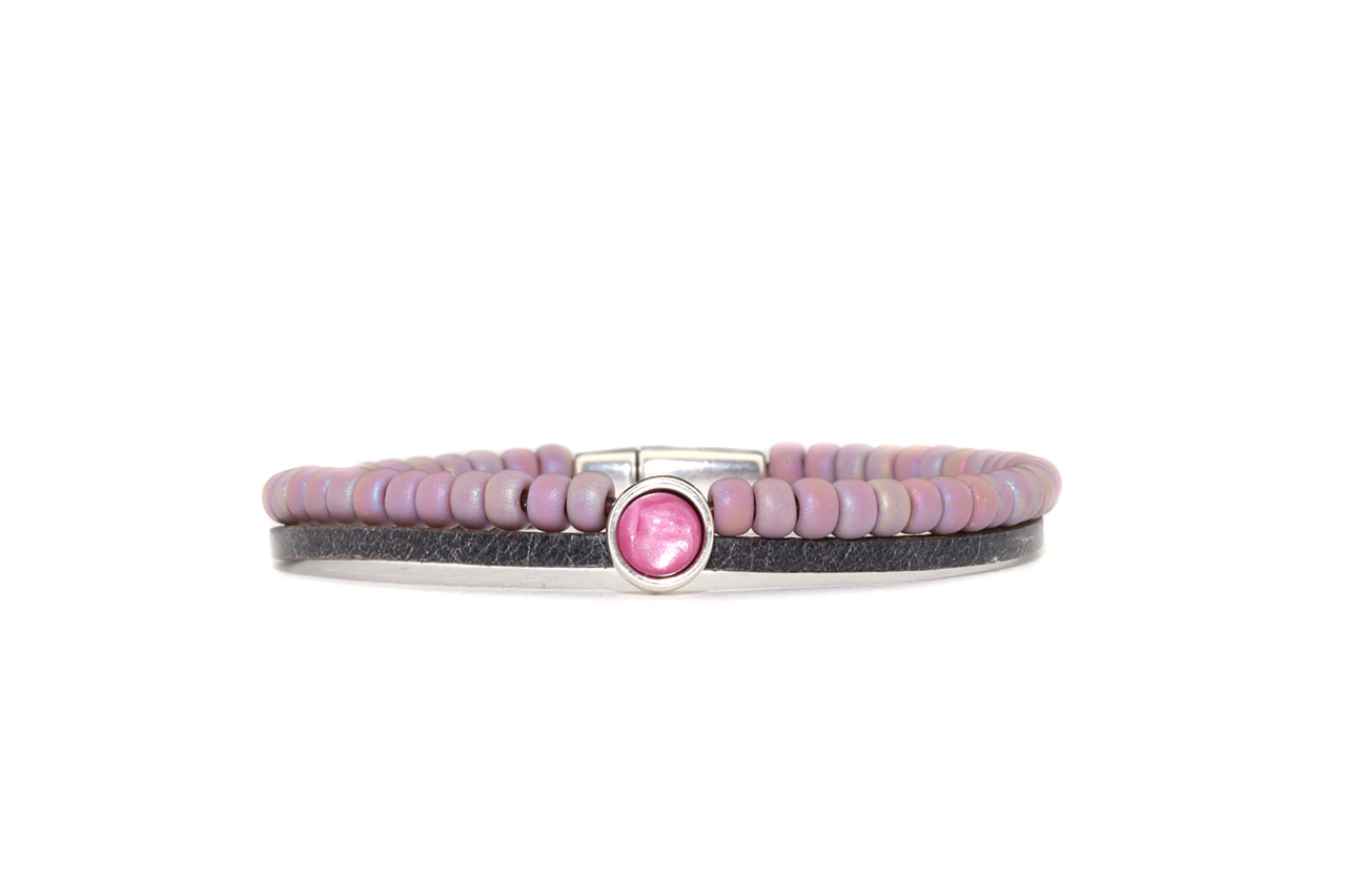 Een combinatie van 2,5 mm buffelleer en gekleurde Myuki kralen met in het midden een setting voorzien van een 6 mm cabochon. De armband sluit met een magneetslot.