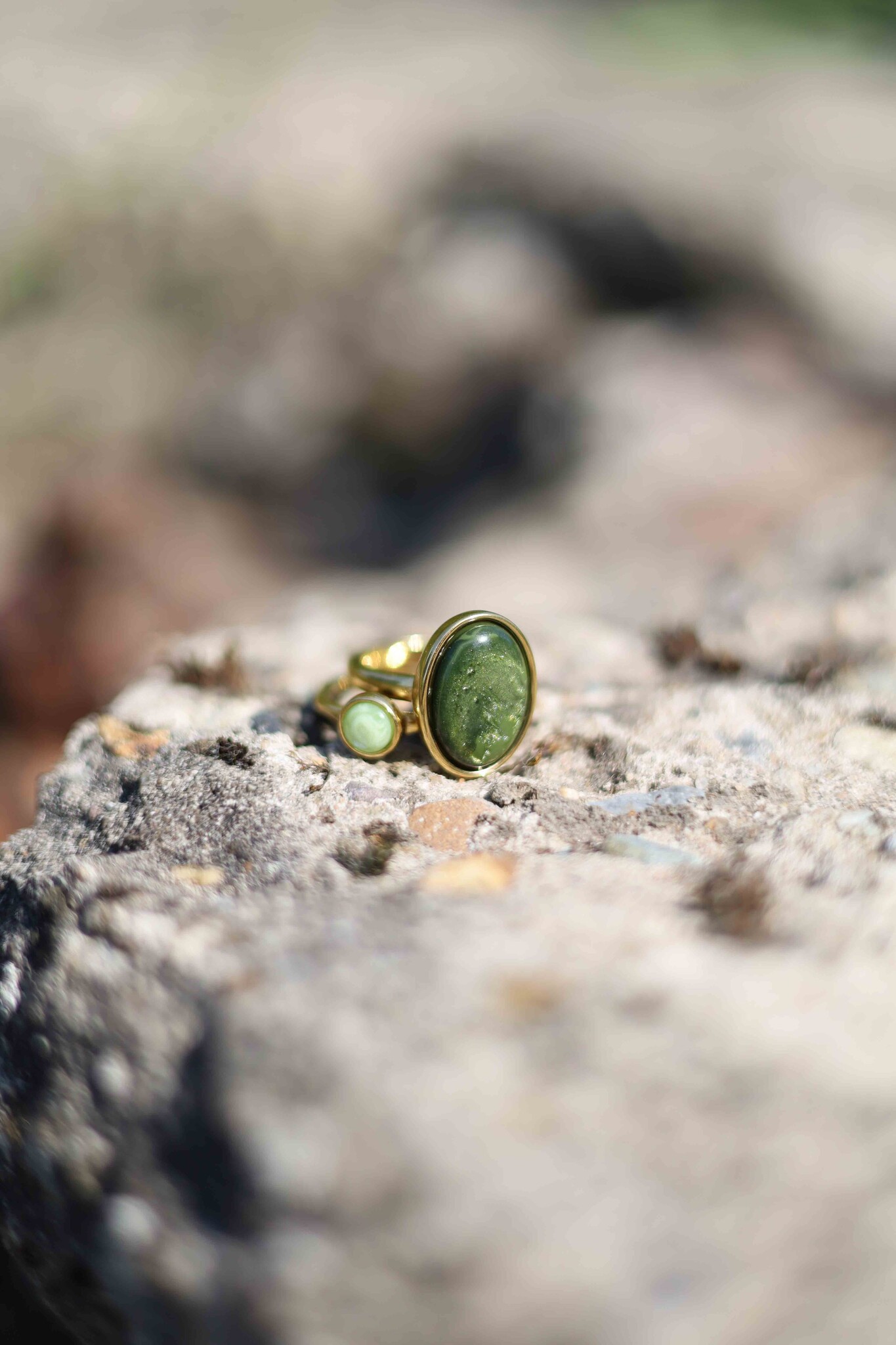 Een smalle ring die bestaat uit goudkleurig, hoogwaardig, stainless steel. Deze combineren we met een mooie 6 mm cabochon. Leuk te combineren met onze andere ringen!