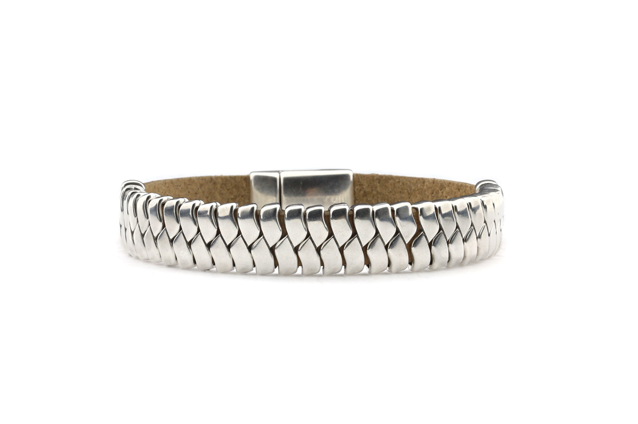 Een leren armband die voorzien is van zilverkleurige schuivers van hoogwaardig en nikkelvrij metaal. De armband is ongeveer 13mm breed en wordt gesloten met een stevig magneetslot.