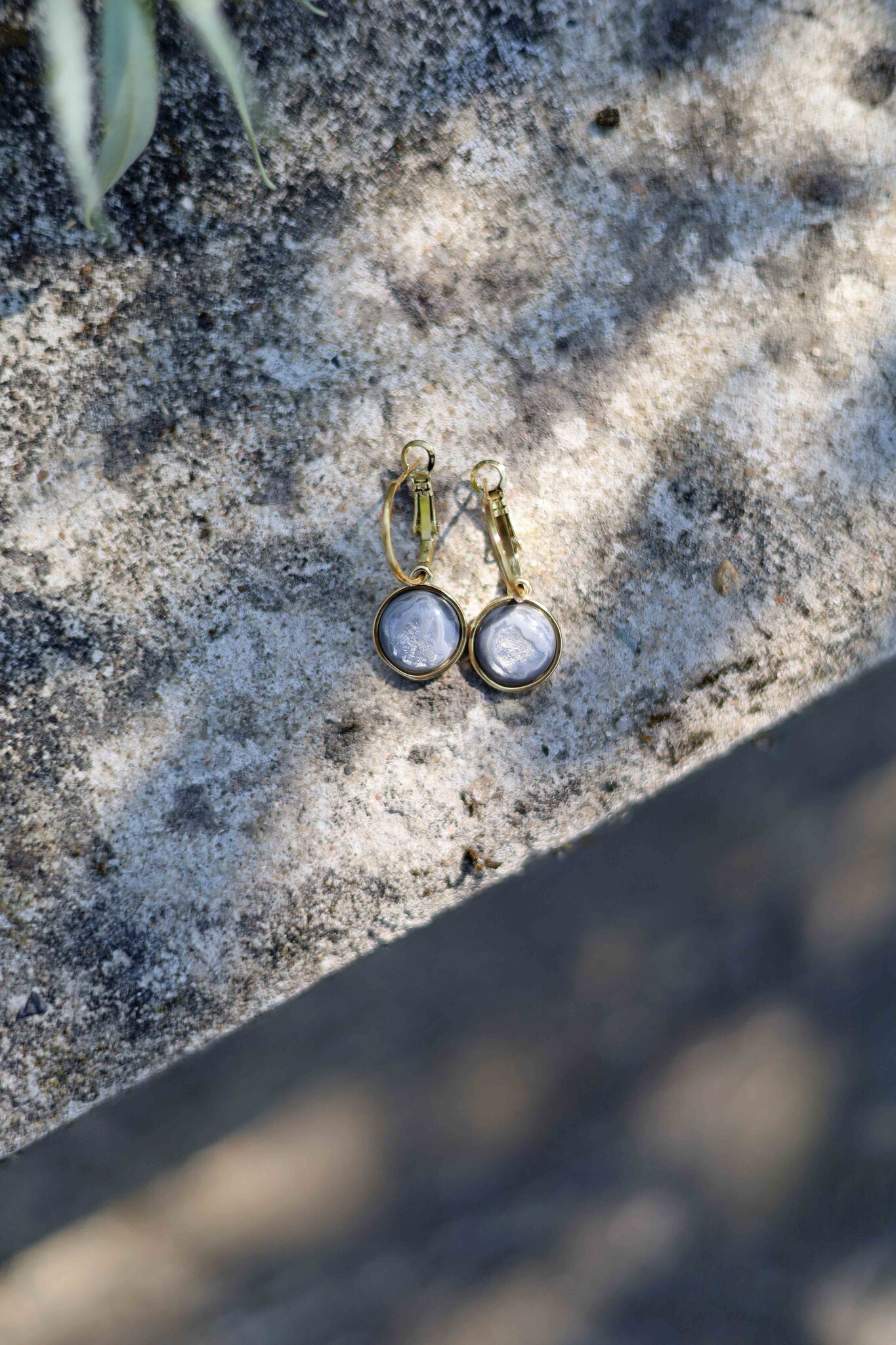 Een creool met daaraan een 12mm setting met een mooie cabochon. De oorbel is gemaakt van hoogwaardig goudkleurig stainless steel en is ongeveer 3,5cm lang.