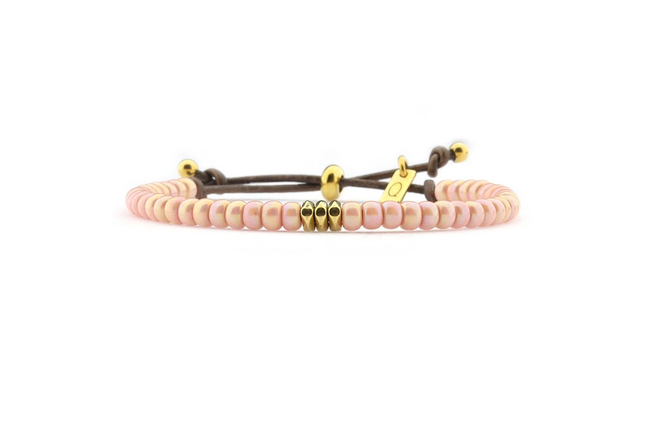 Een kralen armband voorzien van gekleurde en goudkleurige roestvrijstalen kralen. De armband heeft een schuifknoop en een metalen label, verstelbaar van circa 15cm tot 22cm.Verkrijgbaar in 8 mooie kleuren.