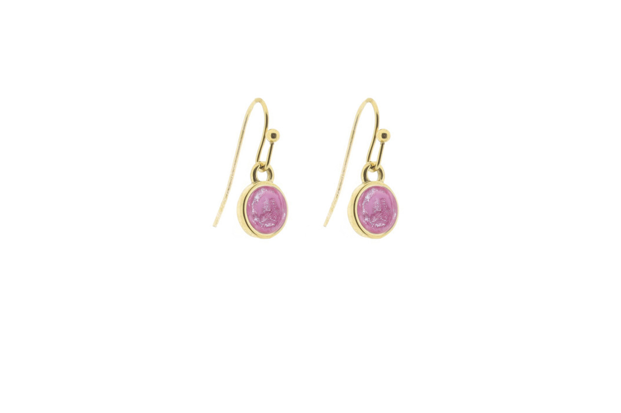 Een oorhaak met daaraan een setting met een 7 mm cabochon. De goudkleurige onderdelen zijn gemaakt van hoogwaardig stainless steel.