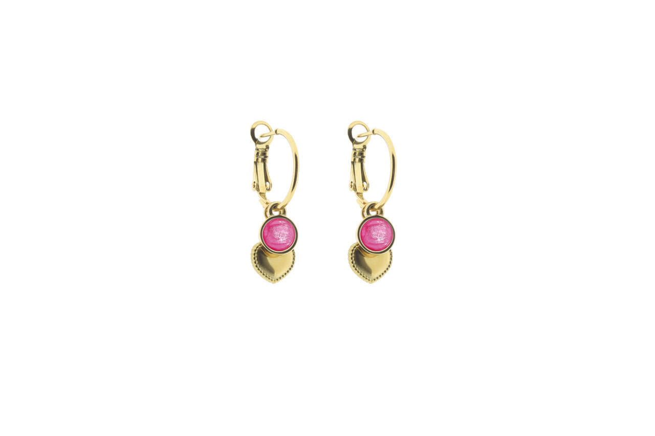 Een oorhanger met daaraan een goudkleurige bedel en een setting van hoogwaardig stainless steel. Deze setting is voorzien van een mooie 7mm cabochon. De lengte van de oorbel is tussen de 35-40mm lang.