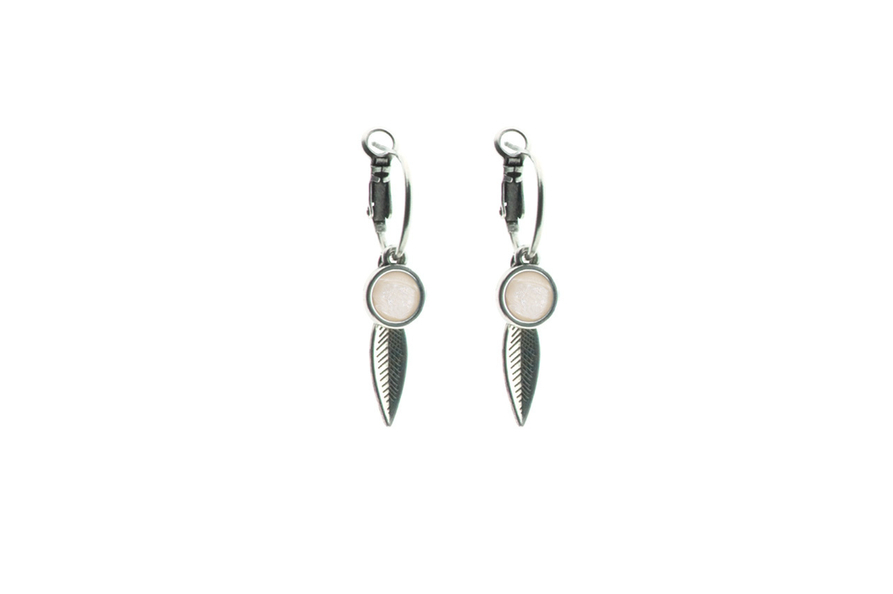 Een oorhanger met daaraan een zilverkleurige bedel en een setting van hoogwaardig, nikkelvrij metaal. Deze setting is voorzien van een mooie 7mm cabochon. De lengte van de oorbel is tussen de 35-40mm lang.