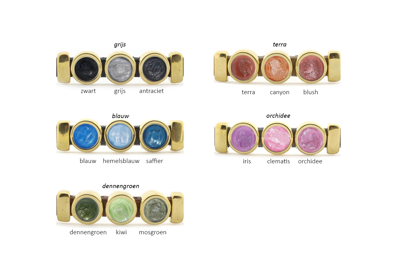 Armband gemaakt van 5mm breed buffelleer, voorzien van een magneetsluiting en 3 settings met 7mm cabochons. De goudkleurige onderdelen zijn gemaakt van hoogwaardig stainless steel.