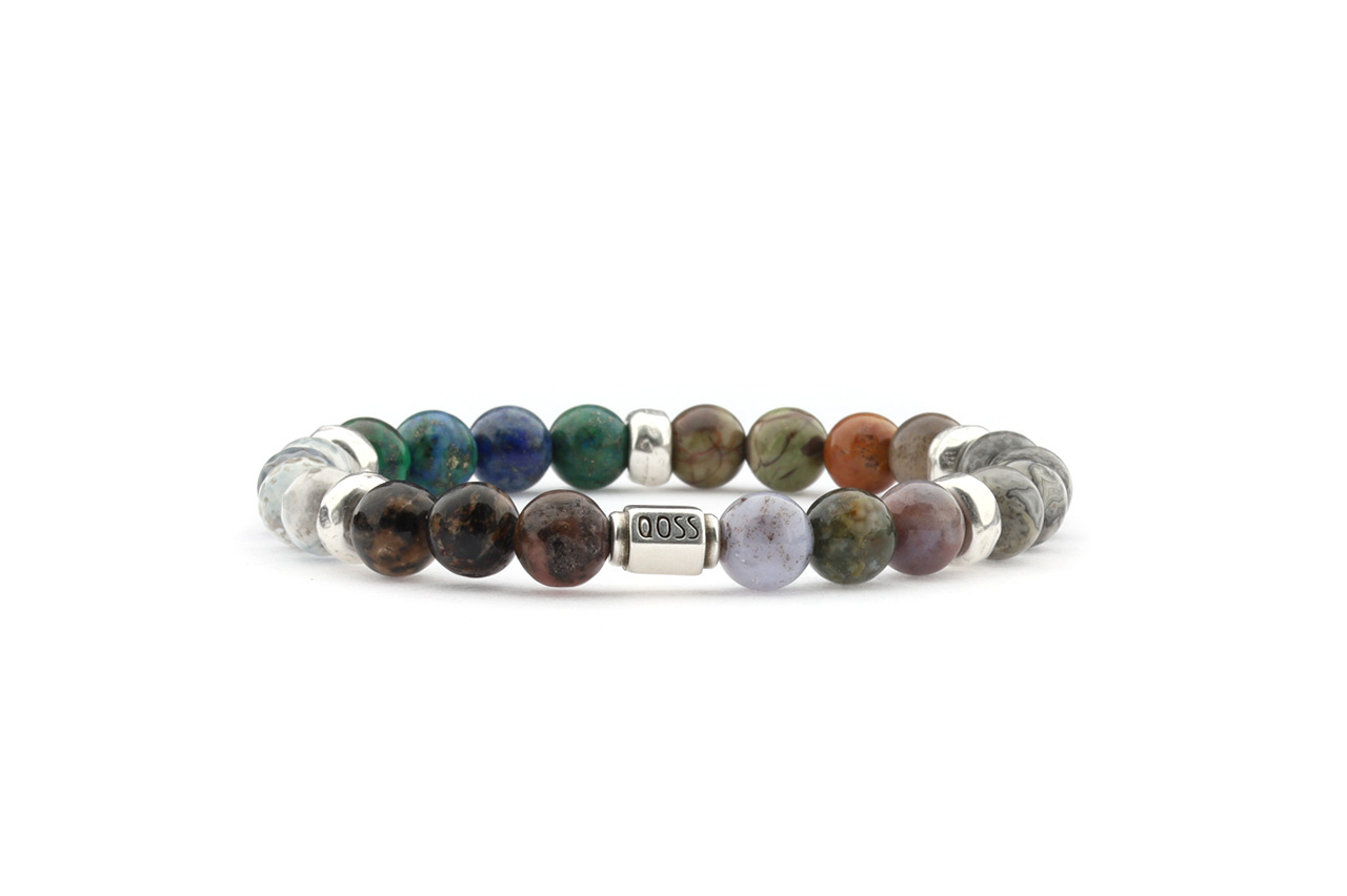 Een natuurstenen kralen armband geregen op elastiek, voorzien van een zilverkleurige tube kralen en diverse natuursteen kralen. Het zilver is gemaakt in hoogwaardig, nikkelvrij metaal. De kralen zijn ongeveer 8mm. De combinatie van kralen is willekeurig.