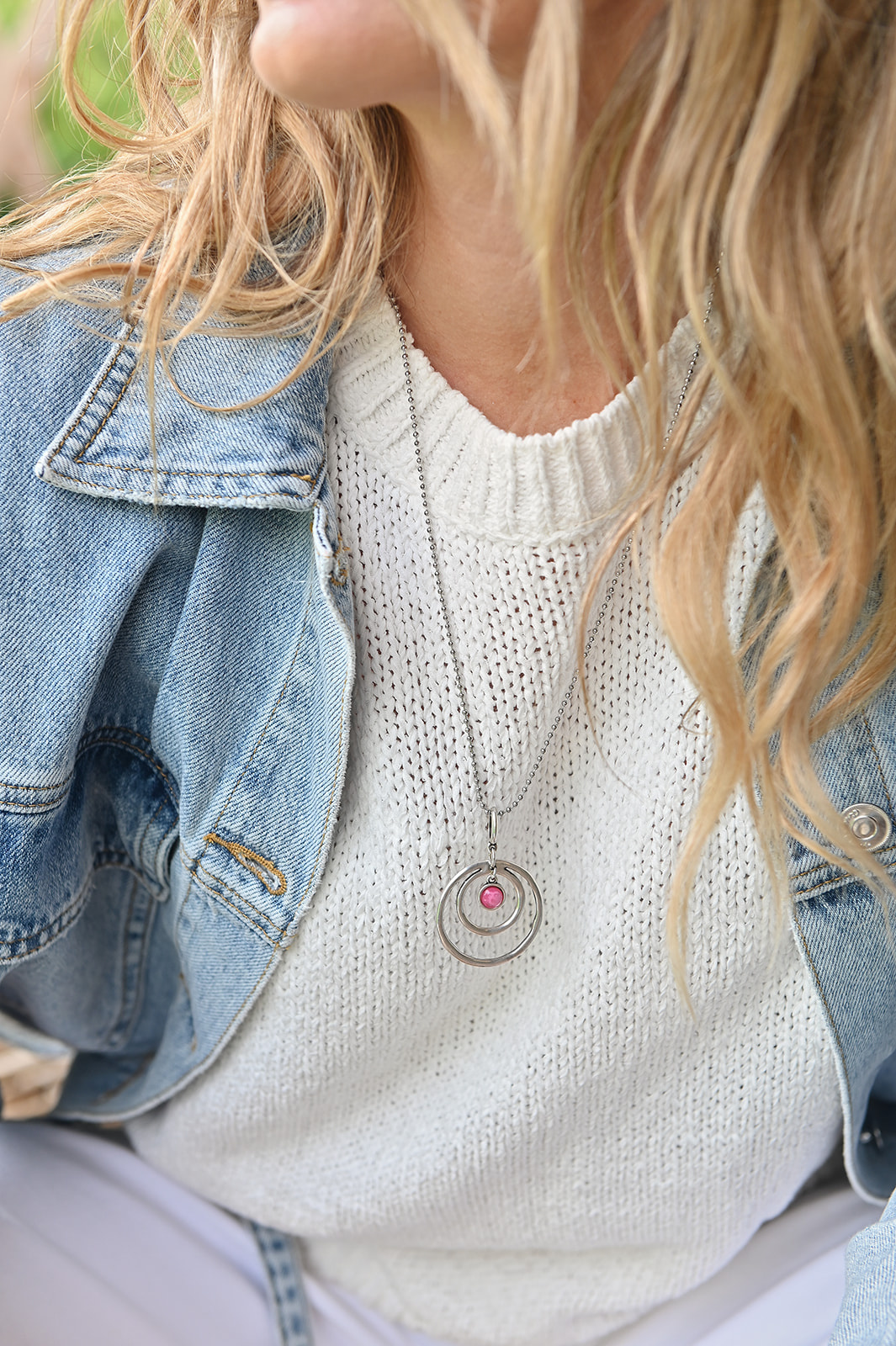 Een hanger bestaande uit 2 cirkels en een 7mm setting van hoogwaardig, nikkelvrij metaal. Deze setting is voorzien van een mooie 7mm cabochon. De perfecte match met onze kettingen en andere hangers. De hanger is ongeveer 5cm lang.