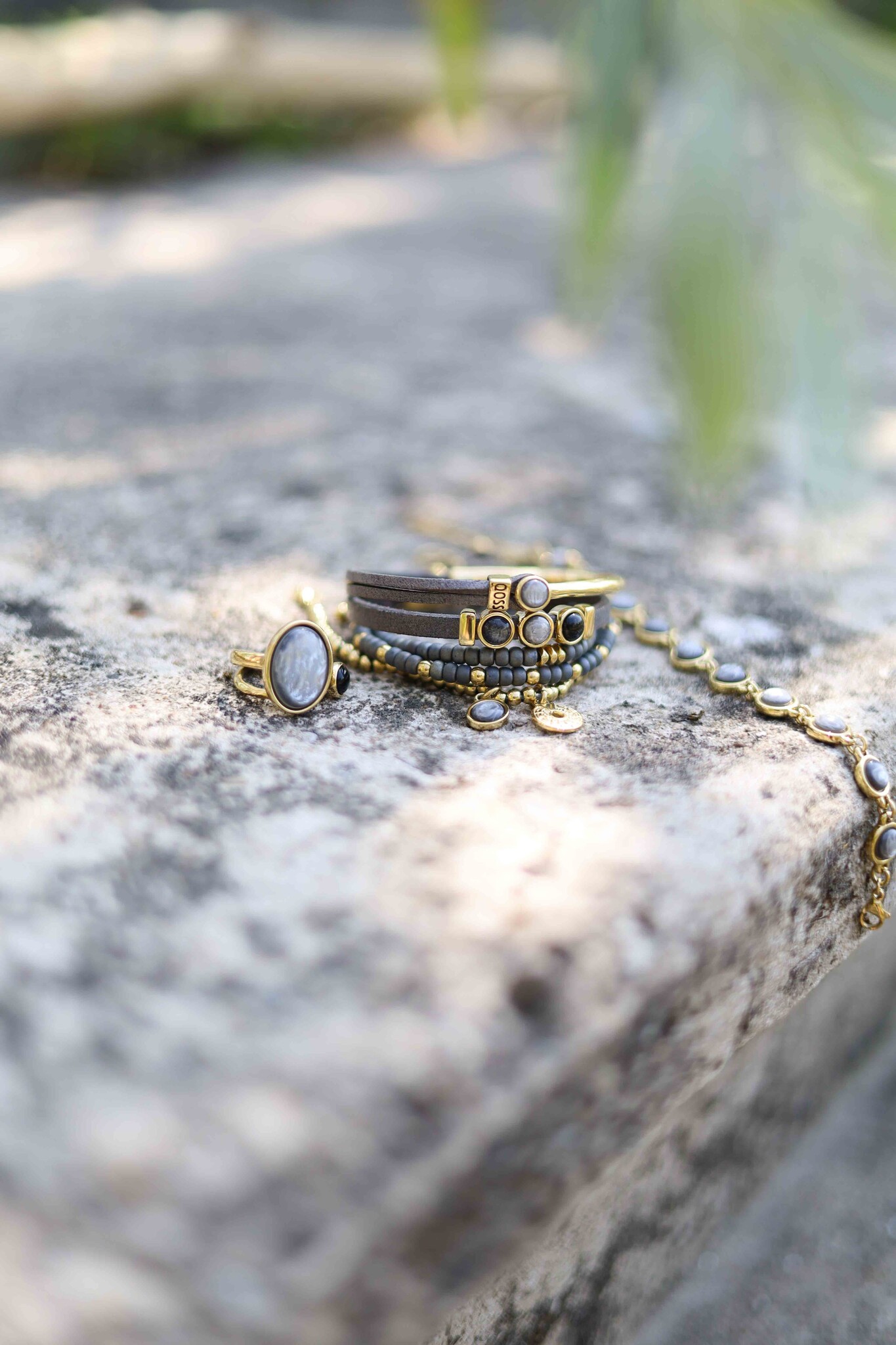 Armband gemaakt van 4 mm ronde, goudkleurige stainless steel, kraaltjes op leer geregen, voorzien van een bedel en een setting met een 7 mm cabochon. Door het karabijnslot en de verlengketting kun je de armband passend maken voor jouw pols! De lengte van de armband is ongeveer 17-21cm.